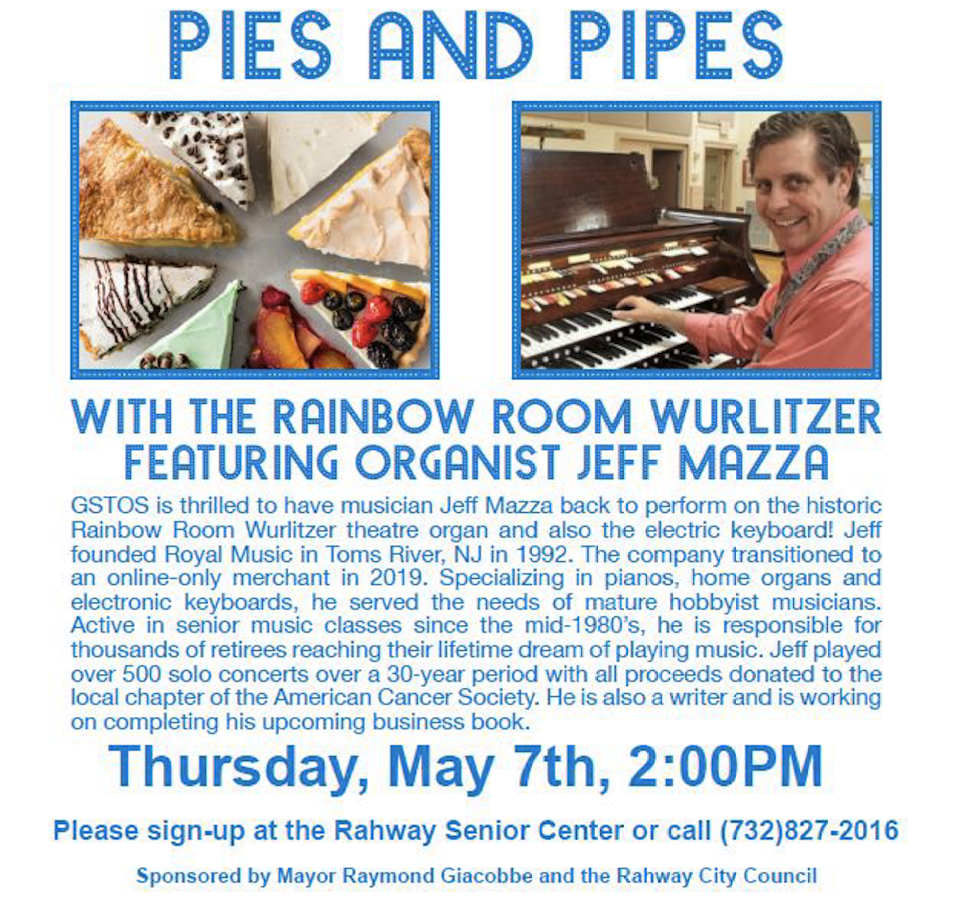 Calendar Experience the sound of the Theatre Pipe Organ Author Admin View all posts Categories Current Events Past Events May 2026 May 2026 Collapse All Expand All May 7 Thu 2026 First Thursday Concert – Jeff Mazza – Pies and Pipes – Rahway Senior Center @ Rahway Senior Center Tickets May 7 @ 2:00 pm – 5:00 pm May 2026 May 2026